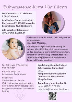 Der nächste Babymassage-Kurs findet im März 2026 im Family Care Center Luzern Süd statt. Jeweils Montag Nachmittag um 14 Uhr.